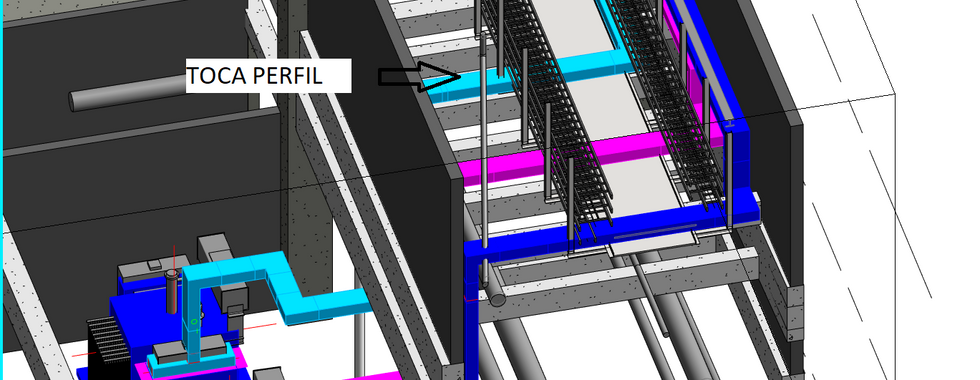 Paso 3) Unión de ambos relevamientos: obra a construir (paso 1) dentro del modelo conforme actual (paso 2). Esta es la etapa en donde se analiza si lo diseñado originalmente es compatible con el lugar de destino. Las siguientes escenas demuestran que el diseño original no es totalmente compatible con la infraestructura actual y tiene que sufrir modificaciones de diseño previamente a su construcción. A continuación algunos ejemplos de interacciones y conflictos: